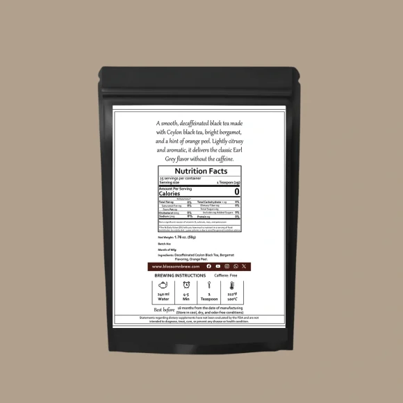Smooth, aromatic, and gently comforting, this Decaffeinated Earl Grey Citrus Black Tea is crafted with decaffeinated Ceylon black tea, bright bergamot flavor, and real orange peel. It delivers the classic Earl Grey character you love, softened into a lighter, more soothing cup that’s easy to enjoy any time of day.
