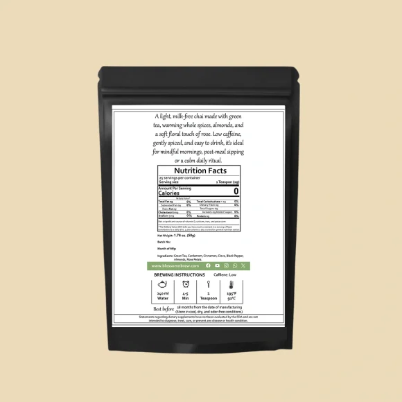 Almonds add a soft, rounded body, while rose petals bring a subtle floral note that lingers after each sip. The result is a clean, balanced cup that feels soothing yet refreshing—perfect for mindful mornings, calm afternoons, or winding down after meals.